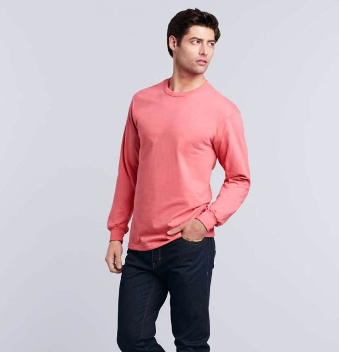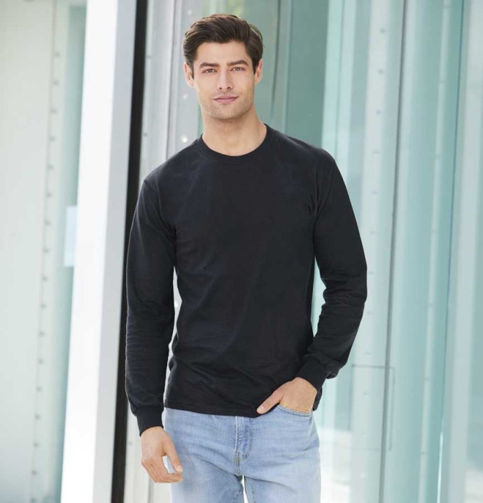 Bawełniana koszulka z długimi rękawami z kolekcji Hammer kanadyjskiej marki GILDAN®. Ta koszulka jest uszyta z grubej dzianiny, wykonanej z czesanej bawełny typu ring spun, wstępnie obkurczanej. Pod szyją zastosowano okrągłe wykończenie z tej samej dzianiny. Rękawy są wszyte prosto i zakończone szerokimi ściągaczami. Po bokach zastosowano szwy stabilizujące, a dół koszulki podwójnie przeszyto. Konstrukcję wzmocniono wewnętrzną taśmą wszytą na ramionach i na karku. Koszulka ma swobodny fason dostępny w dużej rozpiętości rozmiarów.